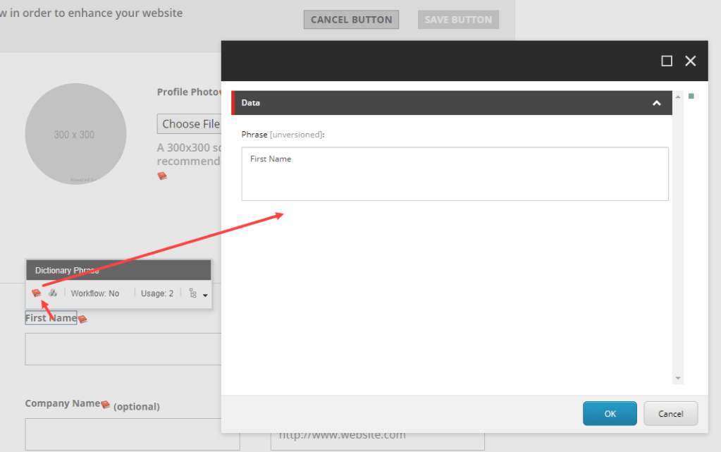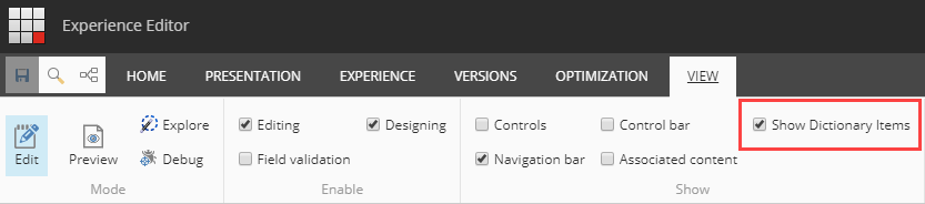 3. When clicking on a Dictionary item value, reveal a custom experience button that allows access to a modal where the Dictionary item can be edited without having to leave Experience Editor.
